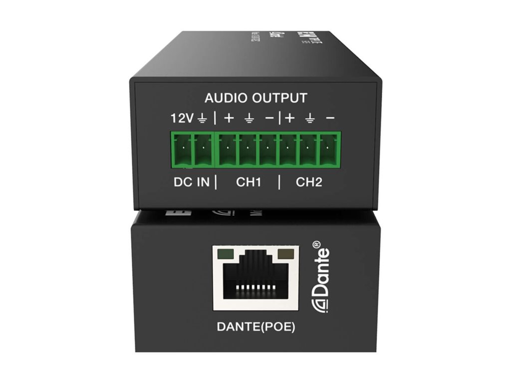 | Features | Dante audio network interface, 96 kHz sample rate, 24-bit audio resolution, AES67 support, RTP support, PCM 2.0 support, 802.3af PoE compliant, 2 channels audio support, up to 100 m connection |
